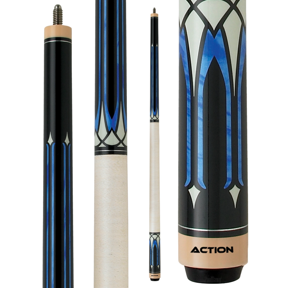 Brand new from Action's exotic line is this stunner with blue and white art deco overlays and a white Irish linen wrap. Wood-to-wood joint provides a very solid hit. As with all Action pool cues, you get quality craftsmanship at affordable pricing